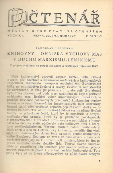 Úvodník nesl burcující název „Knihovny – ohniska výchovy mas v duchu marxismu-leninismu“. Obsahoval myšlenky, které zazněly v referátu Jaroslava Lipovského na poradě školských a osvětových referentů krajských národních výborů. Byl uvozen větou Naše knihovnictví vpravdě zaspalo květen 1945 a psalo se v něm, že knihovnám pomůže připravovaný zákon o jednotné soustavě knihoven. Knihovny budou půjčovat knihy zdarma a také přístup do studoven a čítáren se stane bezplatným. Z knihoven se měl odstranit brak, aby se získal papír na masové vydání klasiků.