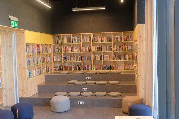 Na druhé straně původní objekt zahrnuje volný výběr pro dospělé, oddělení pro teens, klidnější studovnu, regionální literaturu a dále pak provozní prostory knihovny, tedy provozy, které jsou spíše klidné. Uživatelé pak mají na výběr, který prostor chtějí využít.