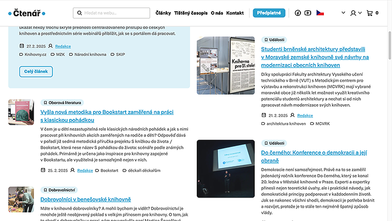 Setkal jsem se rovněž s opatrnými e-mailovými dotazy, zda i nově otevřená webová platforma www.casopisctenar.cz je skutečně otevřená všem pro nejširší škálu témat, námětů a iniciativ. Sice jsem na ně již osobně odpovídal, ale tady to rád zopakuji: Ano, máme ambice být skutečnou kronikou oboru, pozorovatelem a zprostředkovatelem inspirativních nápadů a iniciativ pro všechny, kteří různorodě působí v knihovnictví. Takže neváhejte – pište a posílejte své texty a nápady, které mohou posloužit i vašim kolegům z celé České republiky.