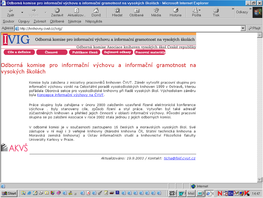 IVIG vypracovala a aktualizovala klíčové dokumenty: Standardy informační gramotnosti VŠ studenta (2004, aktualizace 2007) a Koncepci informačního vzdělávání na VŠ v ČR (2008).