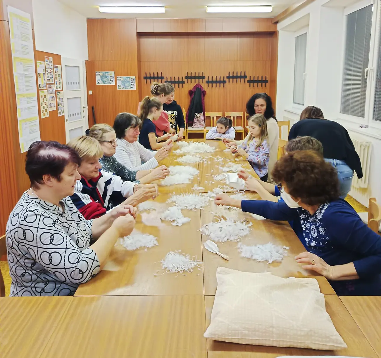 A potom už jsme přistoupili k praxi. Děti si nejdřív vyzkoušely, jaké by to bylo mít polštář s nesedraným peřím – a pak už následovalo očekávané společné draní. Pro všechny děti byla tahle práce naprostá premiéra. Přítomné babičky ochotně vše ukázaly, vysvětlily, a hlavně vyprávěly a vyprávěly, jak se dříve dralo a co všechno u toho zažily; jak se chodilo drát k sousedům, že to sice byla činnost nekonečná, ale bylo veselo a lidé byli pospolu, vyprávěli, zpívali, povídali si. I naše draní bylo opravdu veselé a hodně jsme si procvičili vlastní trpělivost. Ne všichni vydrželi hodinu v klidu pracovat, a tak byl výsledkem naší společné práce jen malý polštářek do postýlky pro panenku. Pro děti bylo překvapením zjištění, kolik hodin by tedy asi trvalo draní peří na polštář a co teprve na peřinu… Při práci poslouchaly, ptaly se a vůbec se nenudily. Pro obě skupiny to bylo příjemné a sbližující setkání. Děti se navíc něco naučily, poznaly a (alespoň některé) si uvědomily, jak nelehký život jejich babičky žily, ale možná i to, že společná dobrá nálada může práci zpříjemnit. A protože každé správné draní končívalo „dodernou“, i naše babičky dostaly na závěr štamprličku a děti něco sladkého.