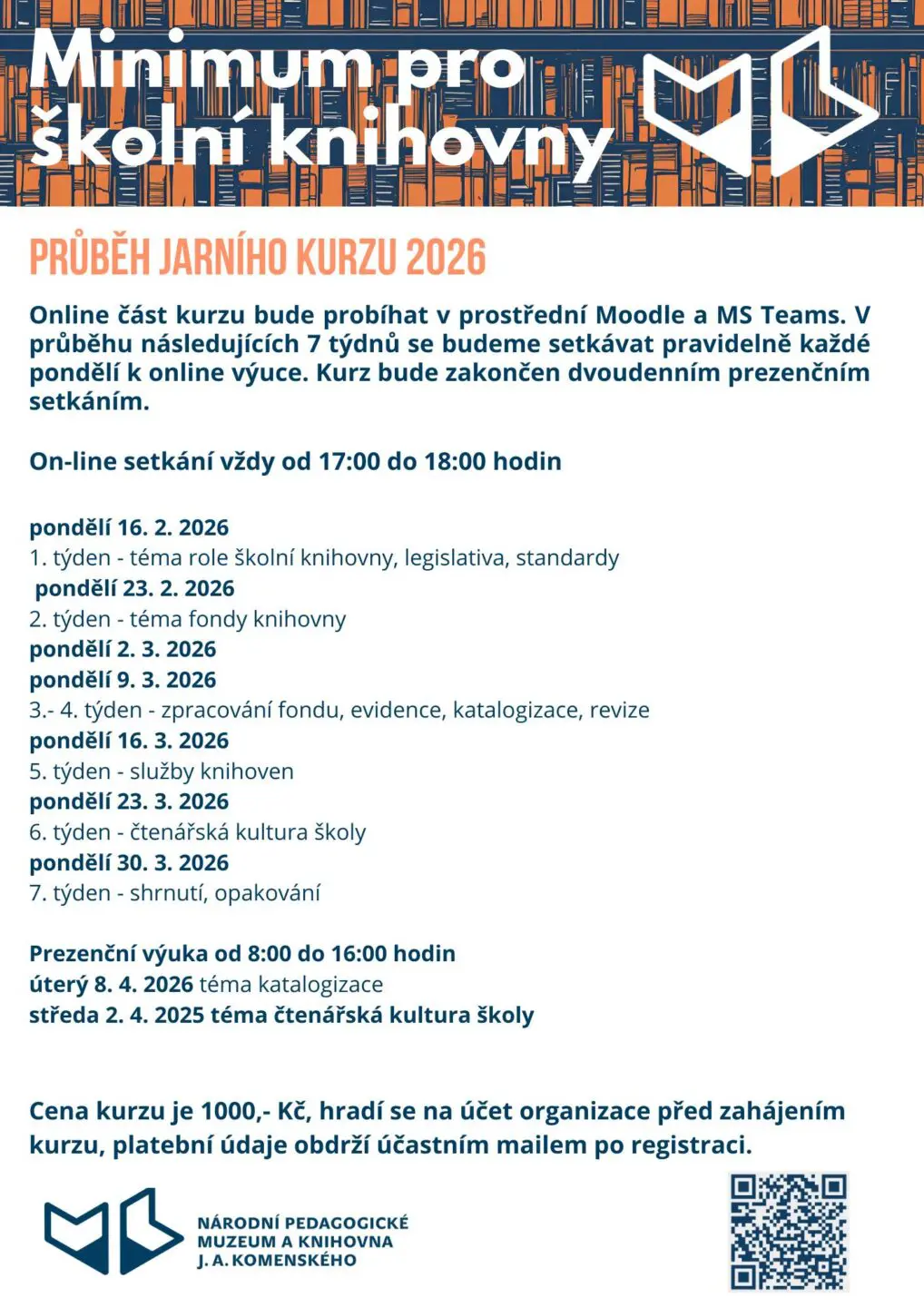 Pro pracovníky knihoven ZŠ a SŠ pořádá Národní pedagogická knihovna J. A. Komenského kurz Minimum pro školní knihovny. Každým rokem proškolí několik školních knihovníků, kterým kurz rozšíří obzory a pomůže jim jejich práci jak profesionalizovat, tak třeba i zjednodušit. Jarní kurz začíná 16. 2. 2026!